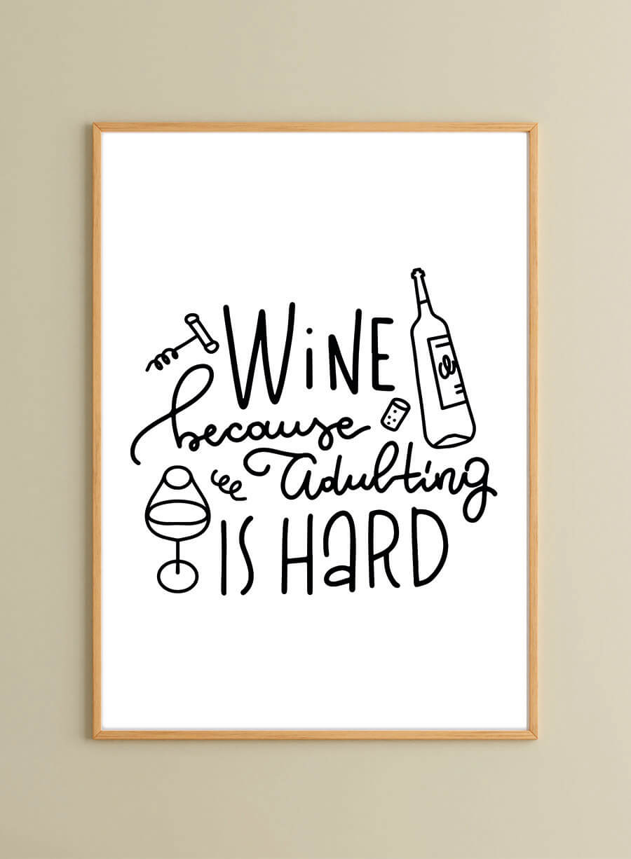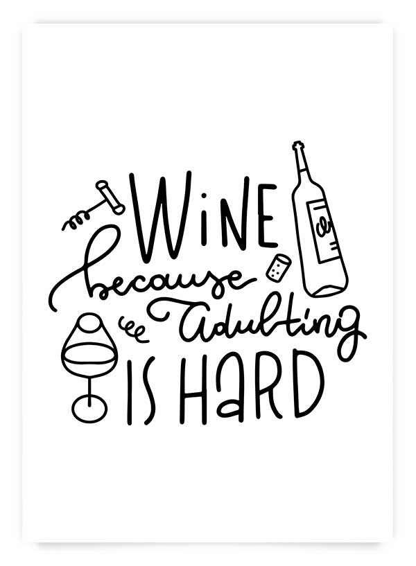 Poster tipografic amuzant cu text 'Wine - because adulting is hard.' și ilustrații line-art.
