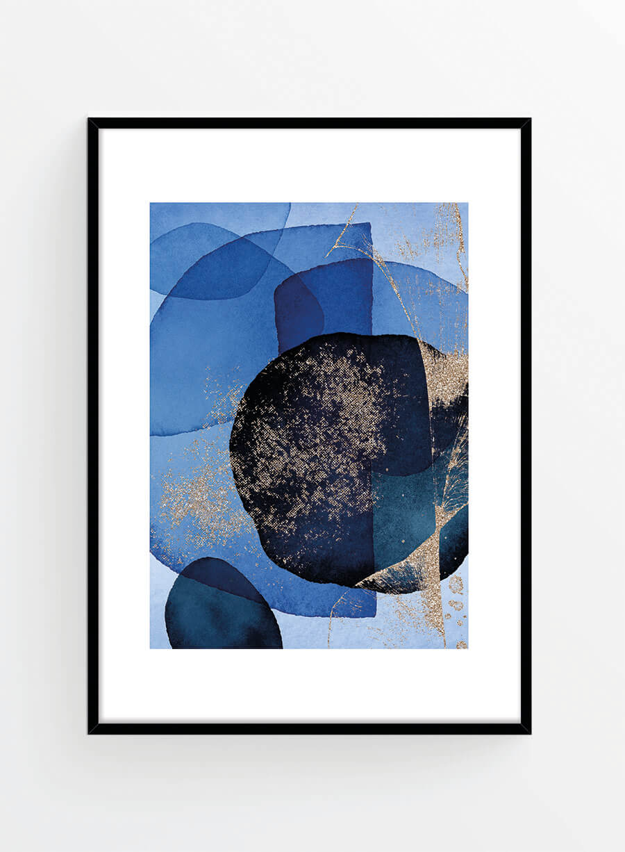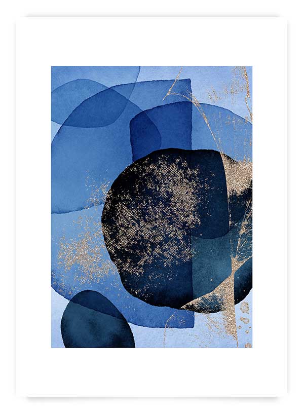Poster abstract cu forme geometrice în nuanțe de albastru și auriu. Îl poți comanda împreună cu modelul 'Abstract blue 2' pentru un set de 2 postere.
