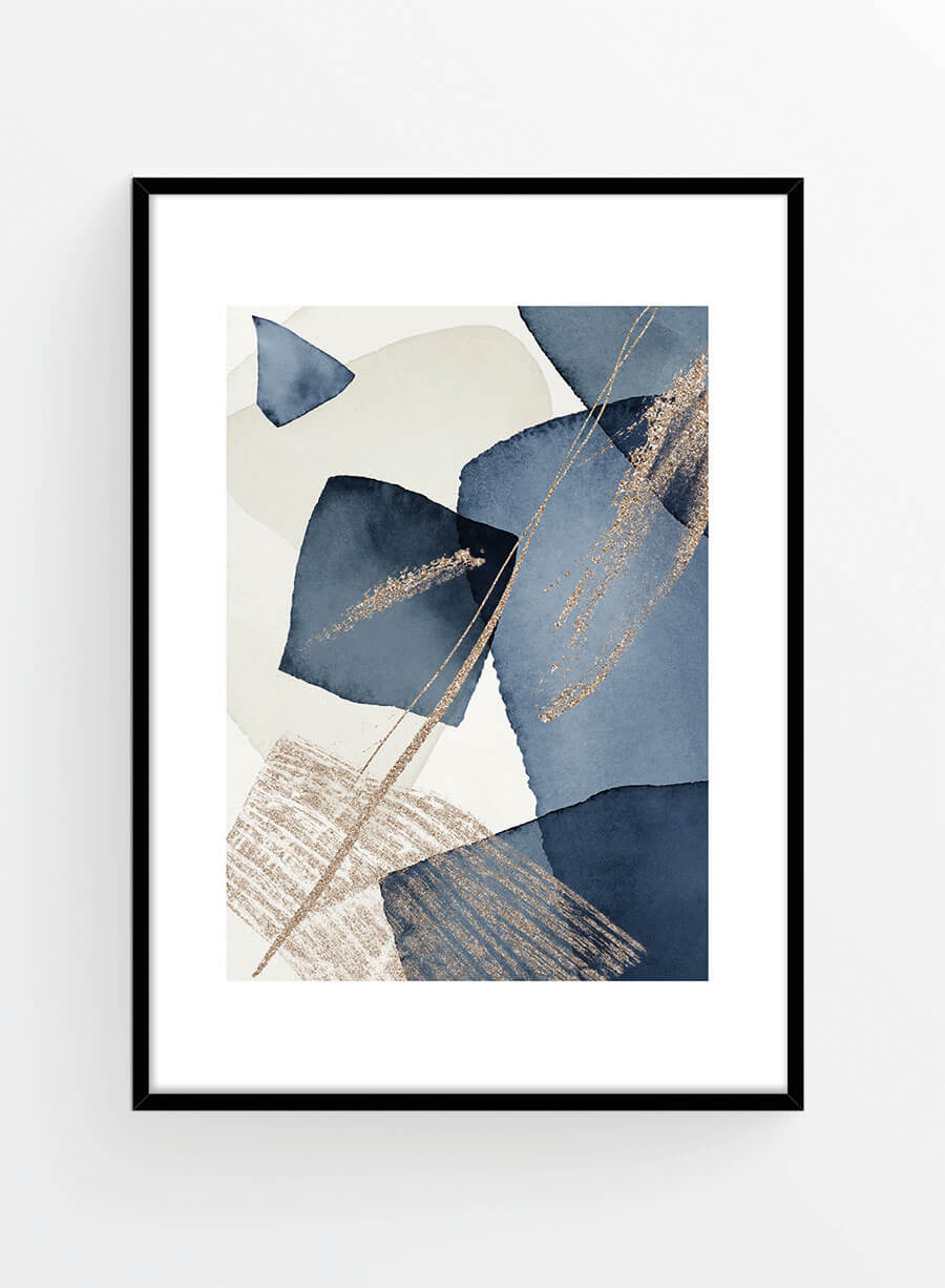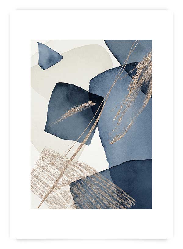 Poster abstract cu forme geometrice în nuanțe de albastru, roz și auriu. Îl poți comanda împreună cu modelul 'Abstract blue 3' și 'Abstract blue 4' pentru un set de 3 postere.