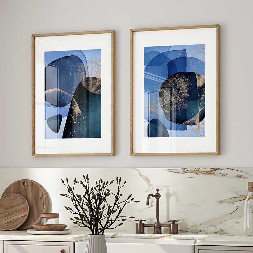 Cu forme abstracte în nuanțe de albastru și auriu setul de două postere se va integra armonios în amenajările interioare în stil minimalist sau contemporan. Plasează-le în living, dormitor sau birou pentru a crea un punct focal captivant. Design-ul posterelor include marginea albă care imită un passepartout.