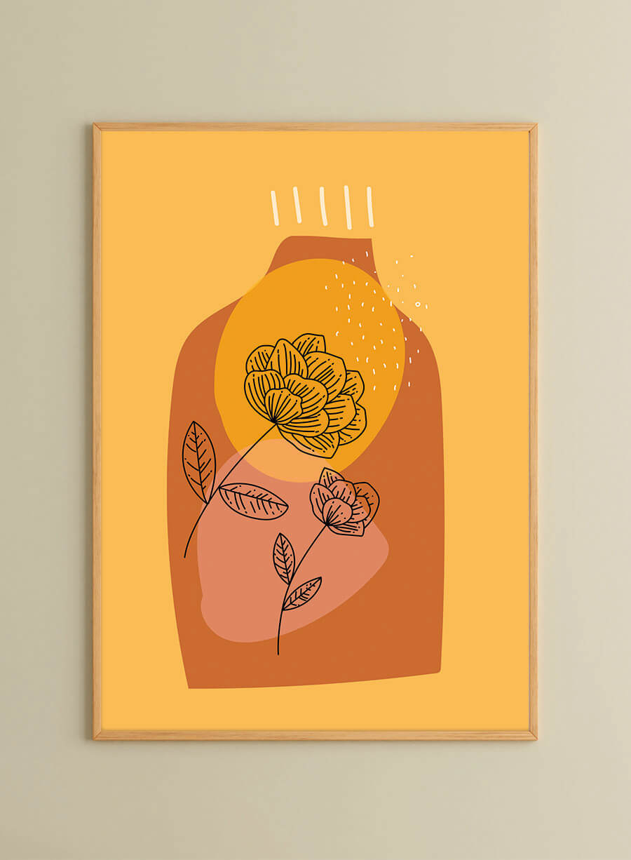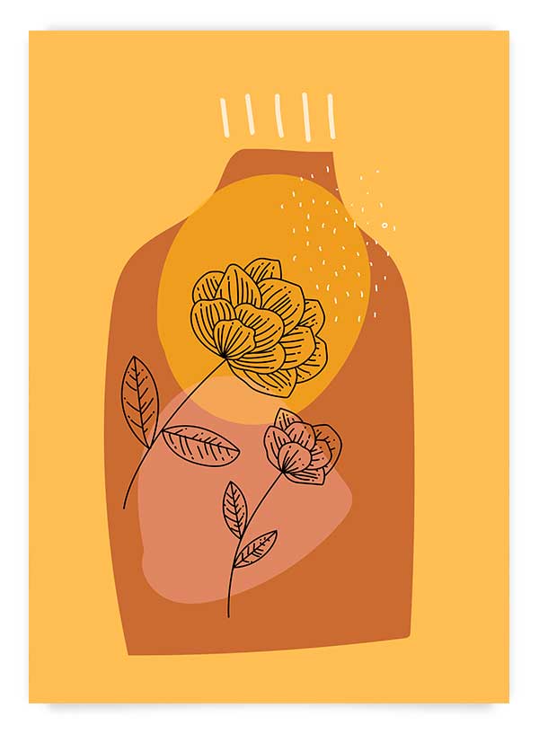 Poster perete modern cu ilustrații elegante pe fundal portocaliu. Poate fi comandat împreună cu celelalte modele 'Abstract Vase'. Adaugă o ramă albă, neagră sau de lemn și decorează bucătăria sau spațiul tău creativ.