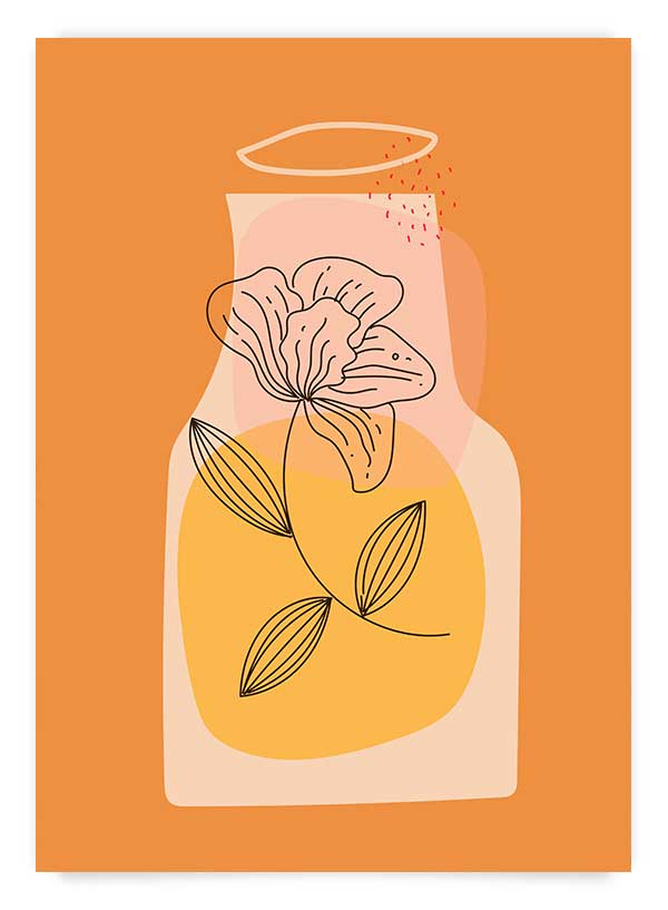 Poster perete modern cu ilustrații elegante pe fundal portocaliu. Poate fi comandat împreună cu celelalte modele 'Abstract Vase'. Adaugă o ramă albă, neagră sau de lemn și decorează bucătăria sau spațiul tău creativ.