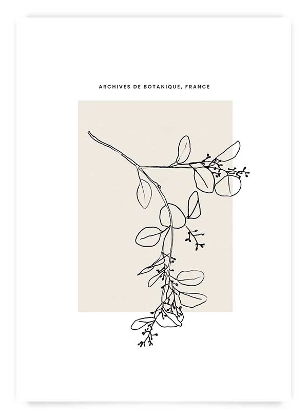 Poster din colecția cu tematică botanică - crenguță cu frunze pe fundal crem și text 'Archives de botanique, France'. Îl poți comanda împreună cu modelul 'Archives de botanique 2' pentru un set de 2 postere.