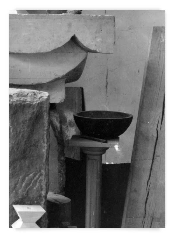 Fotografie alb negru cu atelierul sculptorul Constantin Brâncuși. Posterul are o textură vintage, grainy, care se observă în a doua fotografie.