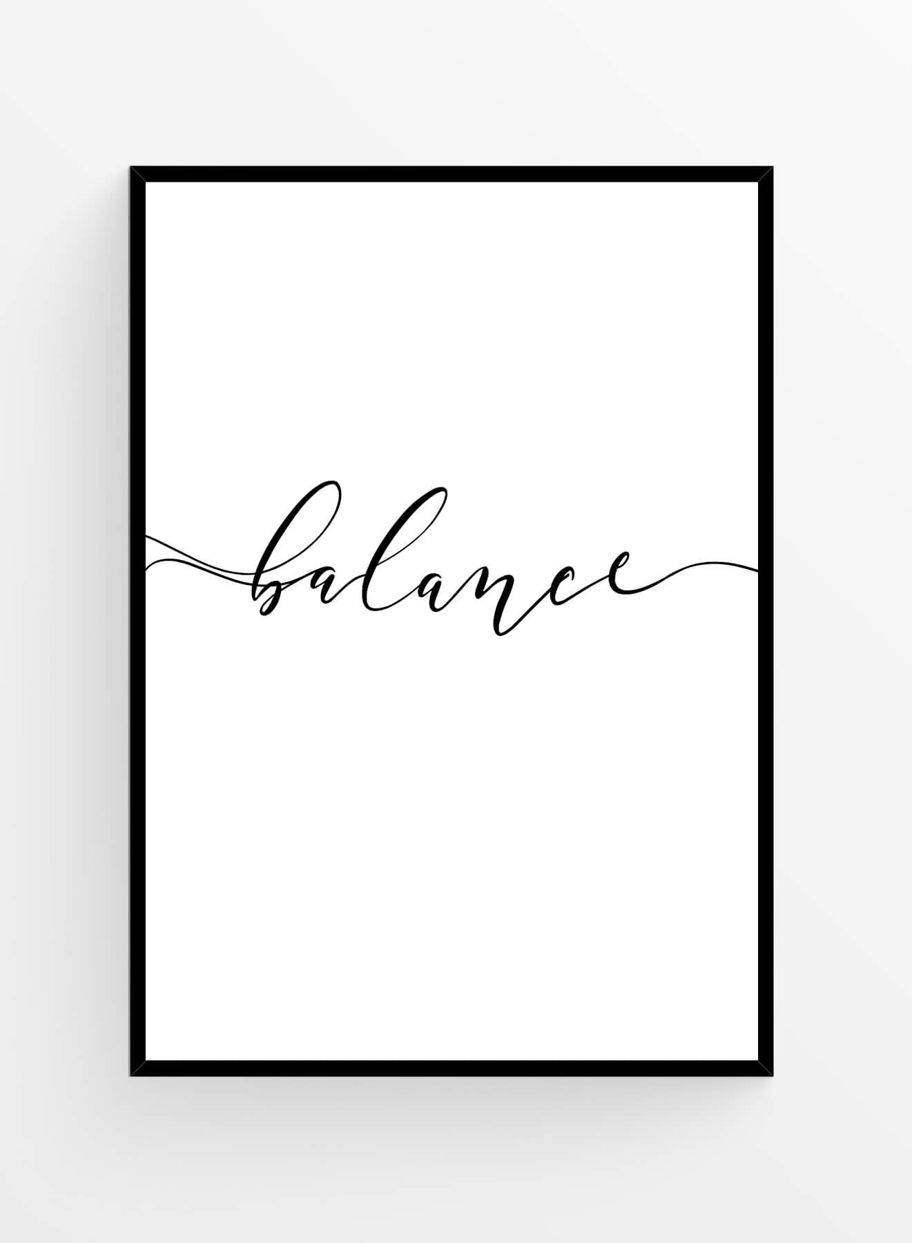 Poster minimalist cu text 'Balance' pe fundal alb. Adaugă o ramă albă, neagră sau de lemn și completează decorul spațiului tău cu eleganță și grație.