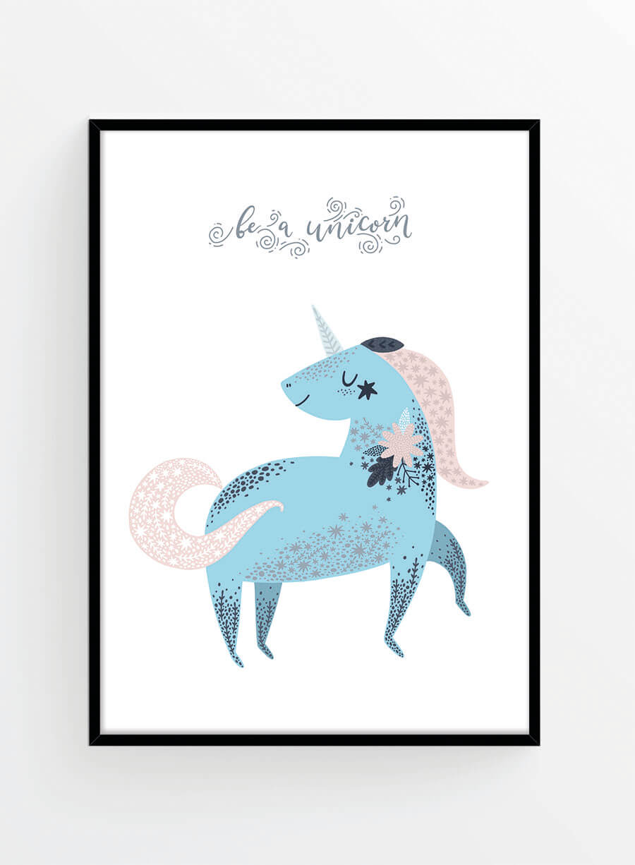 Un poster pentru camera copiilor cu ilustrație unicorn și text 'Be a unicorn'. Culorile pastelate se vor potrivi de minune într-un spațiu plin cu jucării și voie bună.