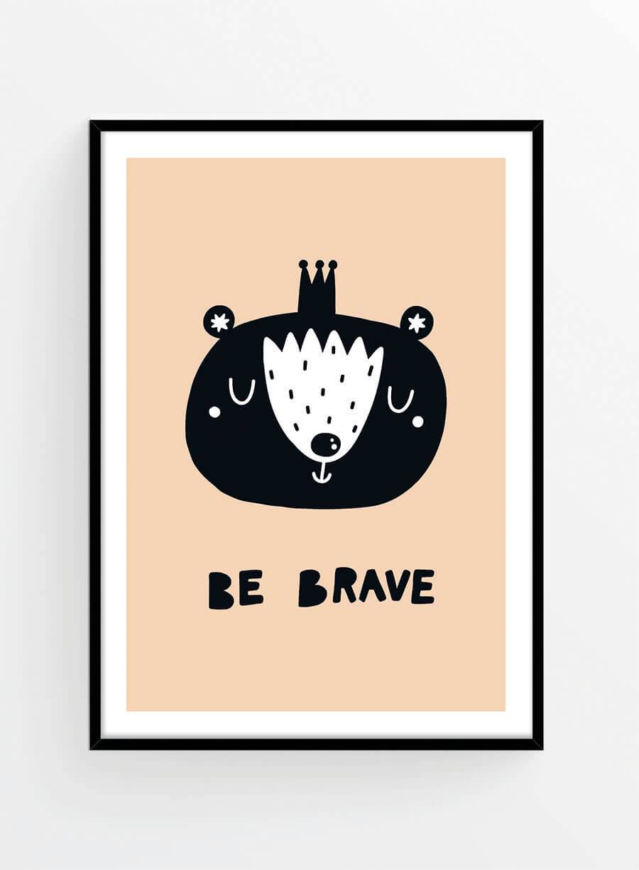 Un poster cu ilustrație ursuleț și text 'Be brave' pe fundal roz pudrat pentru camera copiilor.