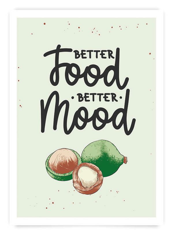 Poster motivațional pentru bucătărie cu text 'Better food better mood' și ilustrație pe fundal verde pastel.