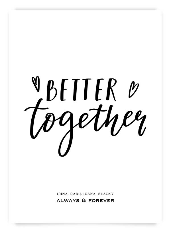 Împreună sunteți mai puternici, nu-i așa? Dăruiește posterul personalizat cu numele tuturor celor din familie. Text inclus în design 'Better together', iar sub nume 'Always & forever'.