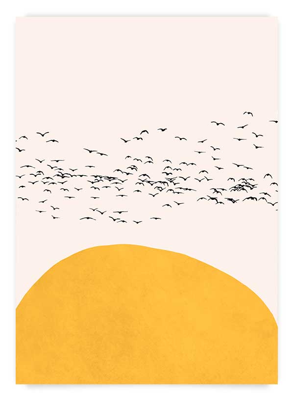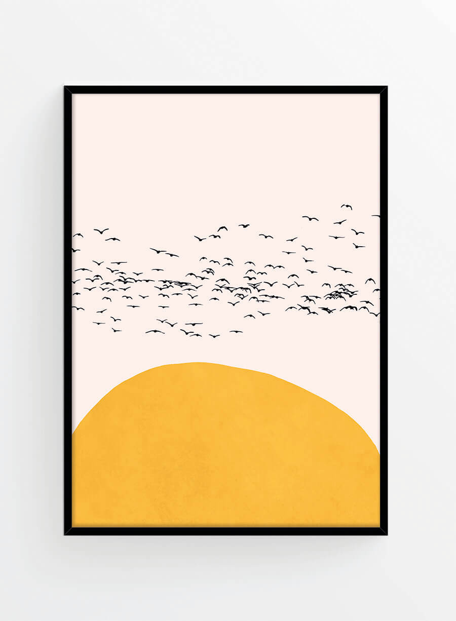 Un poster vesel și visător cu păsări zburând în soare. Îl poți comanda alături de posterele 'Birds in the sun 2' și 'Palms in the sun' pentru un set de 3 tablouri. Nu uita să adaugi o ramă albă, neagră sau de lemn pentru a-l transforma într-un tablou.