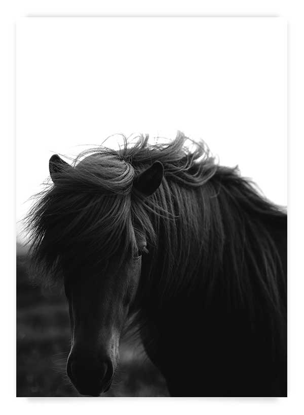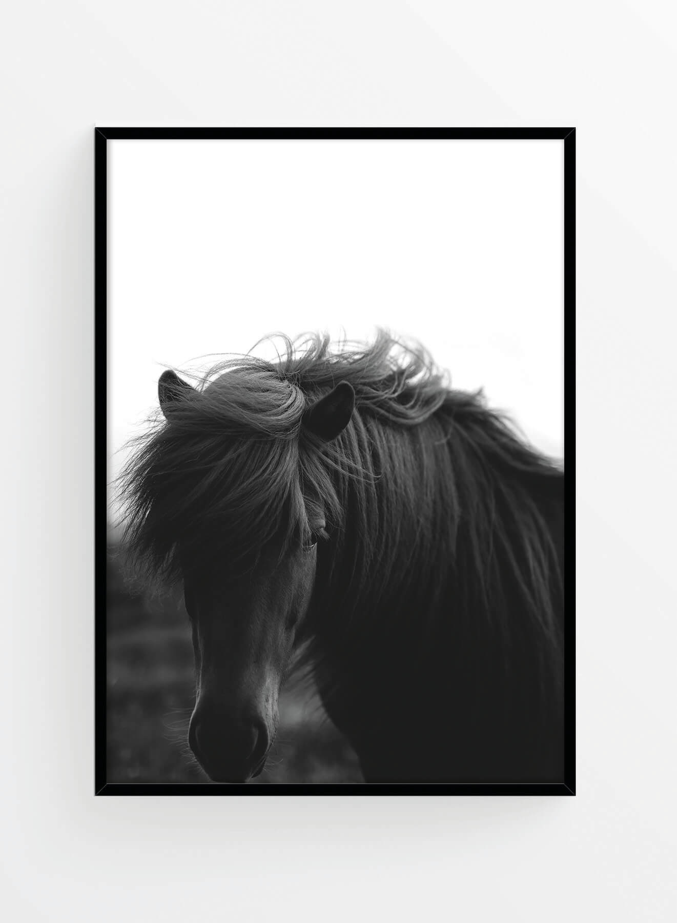 Poster fotografie cal negru care se potrivește perfect într-un dormitor boem alături de un poster motivațional.