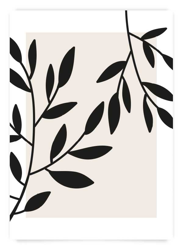 Poster cu ilustrații botanice în alb-negru și fundal bej. Frunzele negre, stilizate, creează un contrast interesant care se integrează armonios în spațiile minimaliste sau în decorurile cu accente naturale.