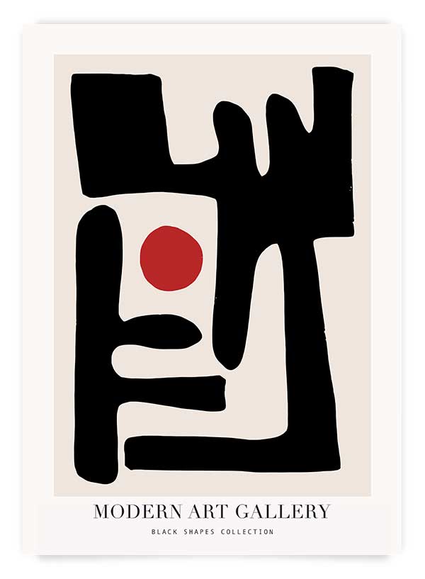Poster modern minimalist cu forme geometrice pe fundal bej și text 'Modern Art Gallery - Black Shapes Collection'.