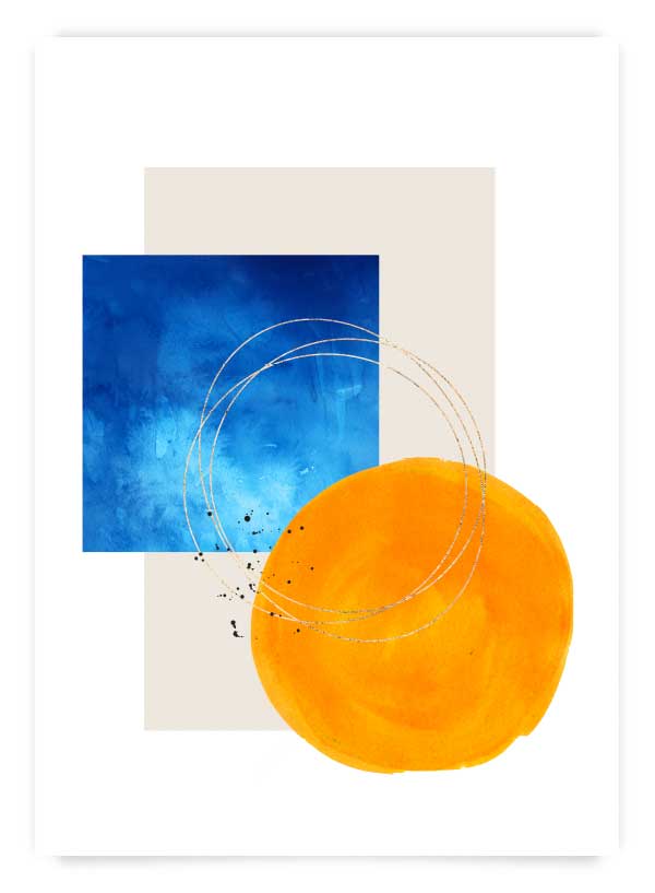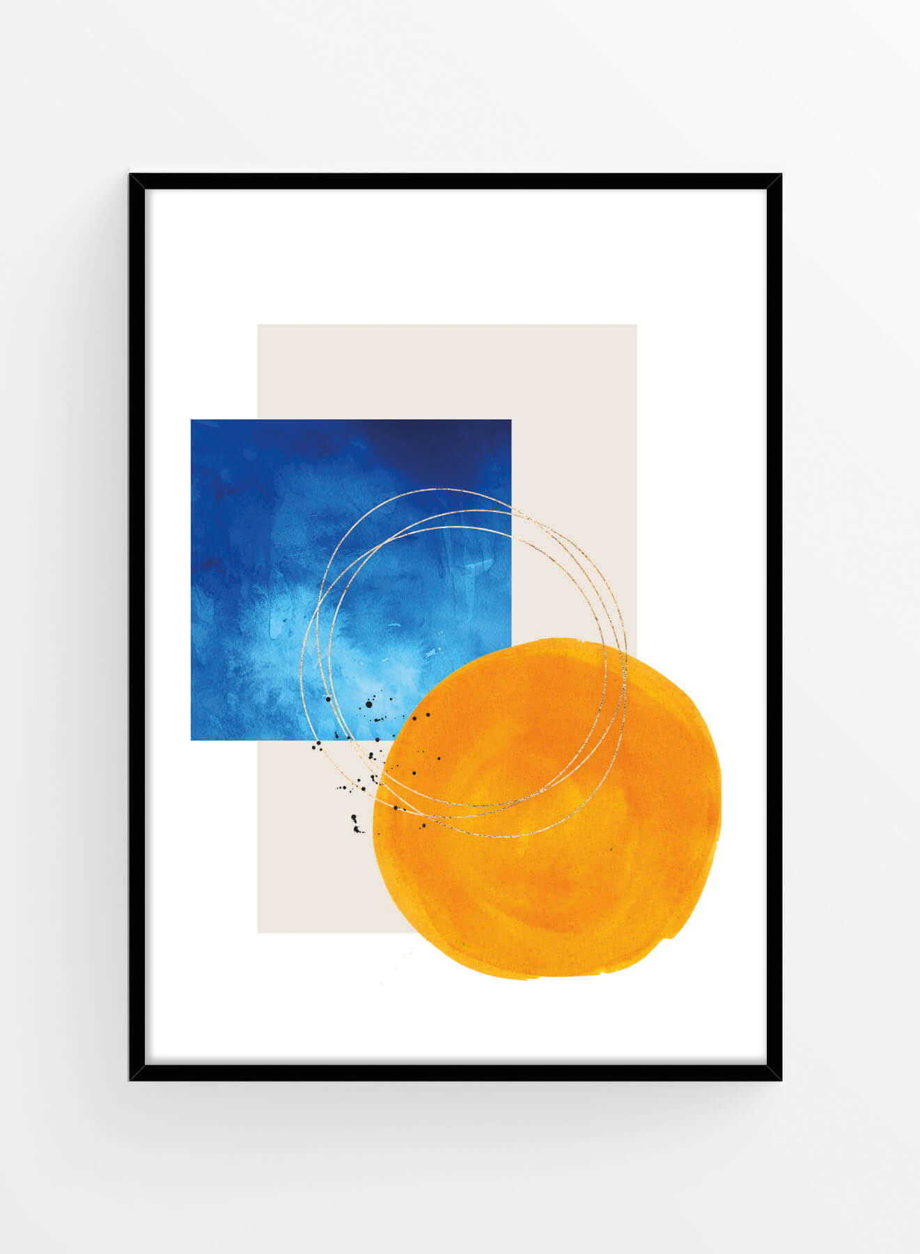 Un poster geometric în culori vibrante - albastru și portocaliu, cu detalii subtile aurii. Adaugă o ramă albă, neagră sau de lemn și bucură-te de un tablou de efect.