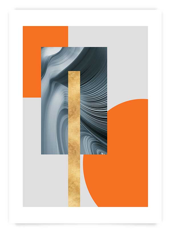 Ilustrații geometrice colaj în nuanțe de albastru, portocaliu și auriu pe fundal gri. Design-ul posterului include marginea albă.