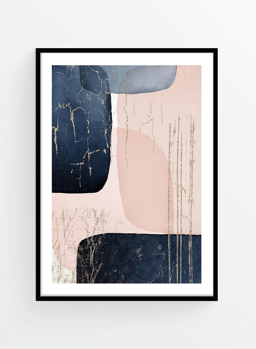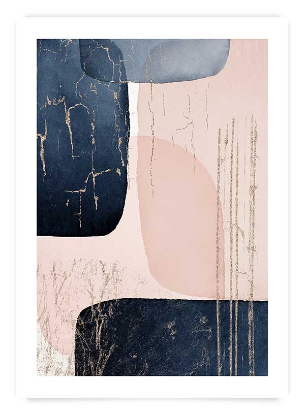Poster abstract cu forme geometrice în albastru și roz, precum și inserții discrete de auriu. Poate fi comandat împreună cu modelul 'Blue & pink 2' și pentru un set de 2 postere.