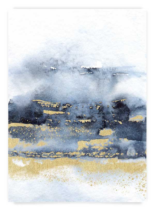 Texturi abstracte în nuanțe de albastru și auriu. Posterul se poate comanda împreună cu celelalte modele 'Blue Watercolor'. Îți recomandăm să alegi rame albe sau aurii care vor scoate în evidență culorile posterelor.