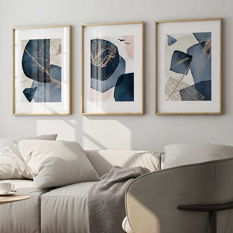 Plasează-le în living, dormitor sau spațiul de lucru pentru a crea un punct focal atrăgător și plin de personalitate. Posterele abstracte în nuanțe de albastru și auriu aduc o atmosferă de serenitate și modernism. Design-ul include marginea albă care imită un passepartout (vezi prima imagine).
