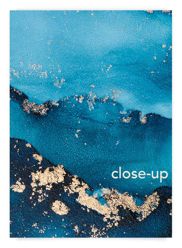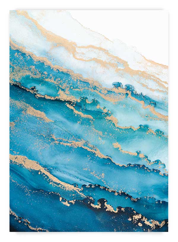 Poster abstract în nuanțe de albastru și auriu. Posterul are o textură grainy, vezi fotografia close-up.