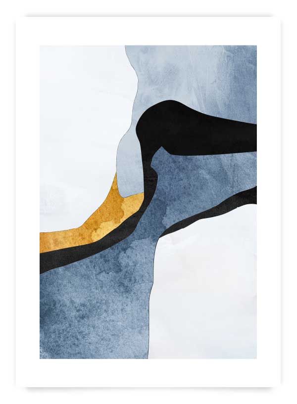 Poster statement cu forme geometrice în albastru pe fundal gri. Se poate comanda împreună cu modelele 'Blues 2' și 'Blues 3' pentru un set de 3 postere. Design-ul posterului include marginea albă.