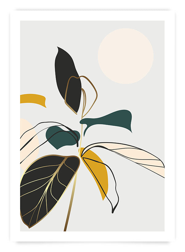 Poster cu ilustrație florală în nuanțe de galben, verde și gri închis, pe fundal gri. Se poate comanda împreună cu 'Botanic & Yellow 2, 3 sau 4'pentru a forma un set de 2, 3 sau 4 postere.