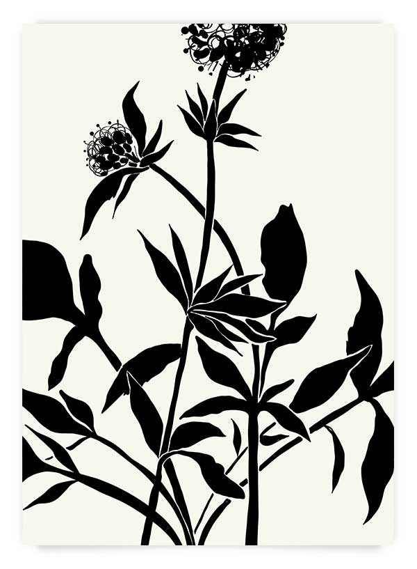 Poster alb negru din colecția cu tematică botanică - crenguță cu frunze și flori. Poate fi comandat împreună cu modelele 'Botanique 2' și 'Botanique 3' pentru un set de 3 postere.
