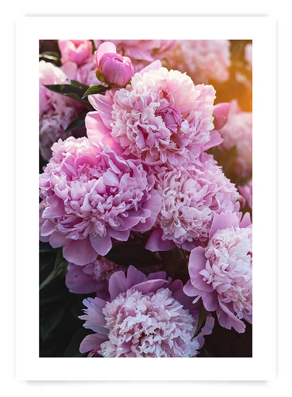 Alege acest poster botanic statement pentru decorarea unui spațiu rustic. Fire de bujori roz înfloriți.