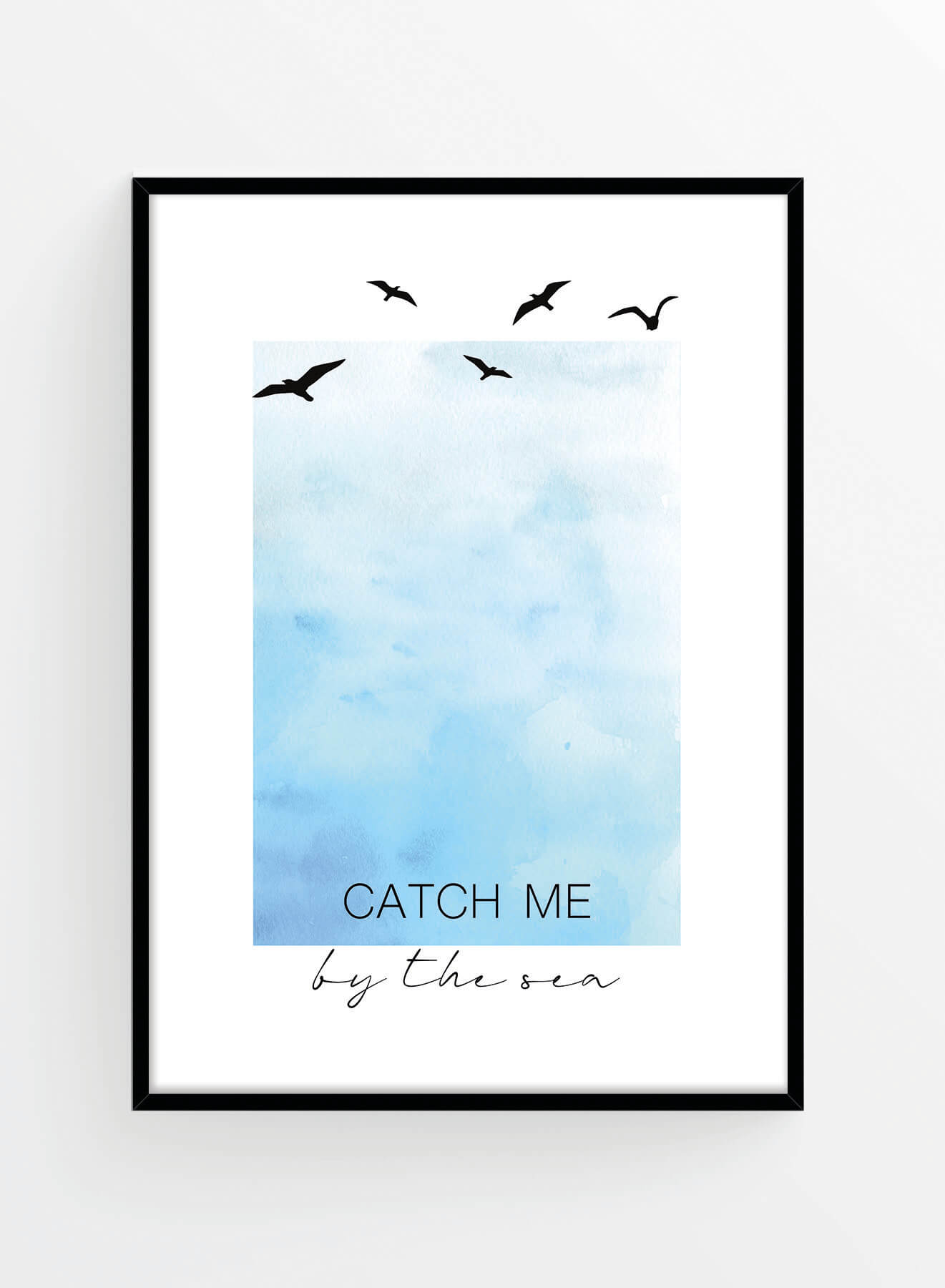 Poster cu text 'Catch me by the sea' și păsări pe fundal albastru watercolor pentru cei care iubesc marea, apa sărată și albastrul cerului. Posterul poate fi comandat împreună cu modelul By the sea 2 și se potrivește într-un interior cu nuanțe delicate de albastru, în holuri sau recepții. Include marginea albă.