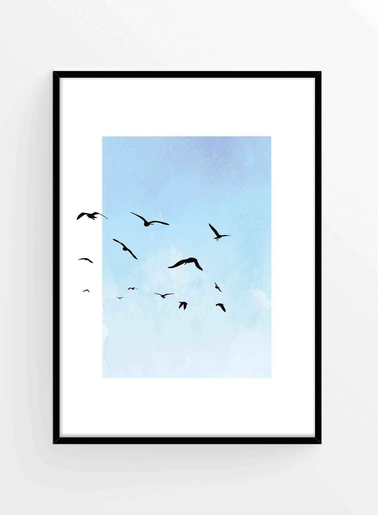 Poster cu păsări pe fundal albastru watercolor pentru cei care iubesc marea, apa sărată și albastrul cerului. Posterul poate fi comandat împreună cu modelul By the sea 1 și se potrivește într-un interior cu nuanțe delicate de albastru, în holuri sau recepții. Include marginea albă.