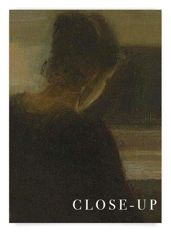 "Femeia care coboară pe scări" este o explorare a luminii, a spațiului și a unui moment cotidian caracteristice stilului distinctiv al lui Carl Holsøe. Lumina discretă creează o atmosferă misterioasă și întărește perspectiva în profunzime.