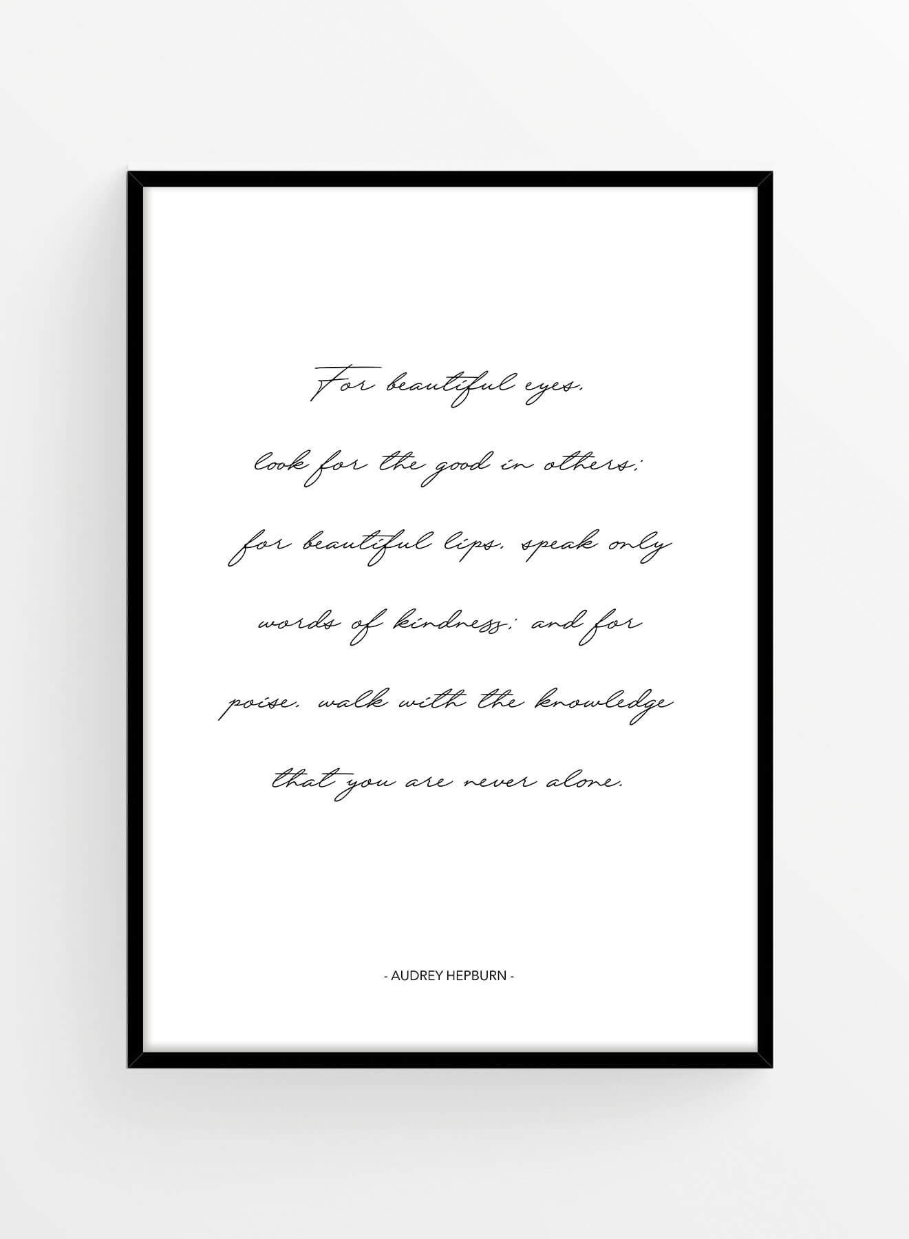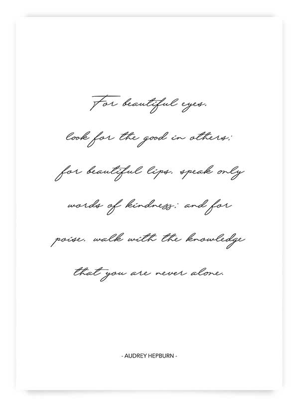 Poster cu un citat emoționant al celebrei actrițe Audrey Hepburn 'For beautiful eyes, look for the good in others; for beautiful lips speak only words of kindness; and for poise, walk with the knowledge that you are never alone.'. Adaugă o ramă albă, neagră sau de lemn și fă-l parte din povestea casei tale sau oferă-l cadou cuiva drag. Îl poți comanda împreună cu un poster fotografie cu Audrey Hepburn pentru un set de două sau mai multe postere.