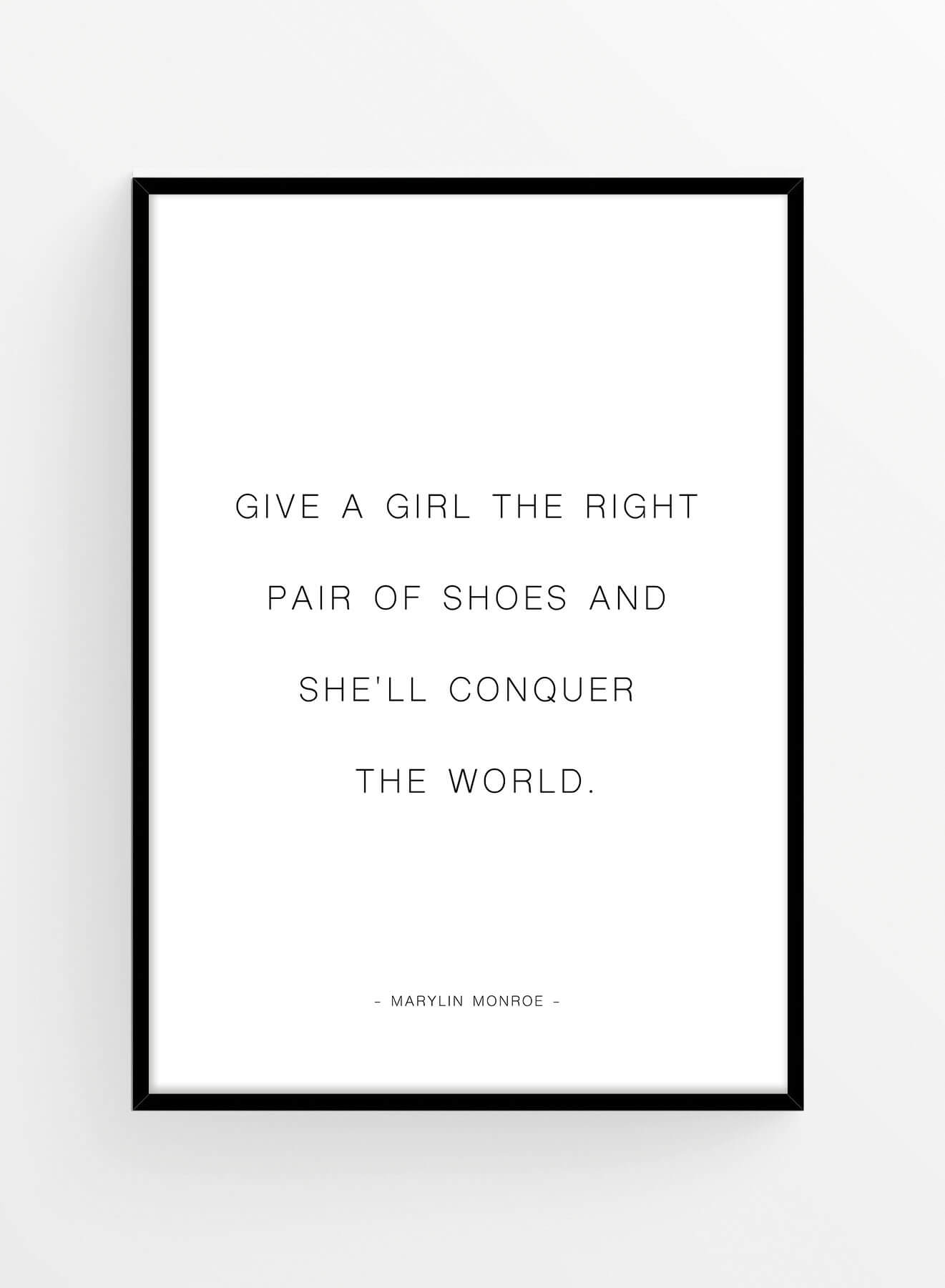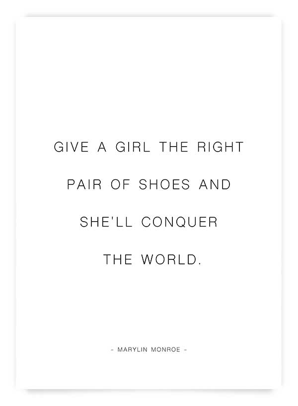 Poster motivațional cu celebrul citat al actriței Marylin Monroe 'Give a girl the right pair of shoes and she'll conquer the world'. Perfect pentru decorarea unui dressing de tip walk-in, a zonei de la intrarea în casă, sau de a fi oferit cadou acelei prietene care iubește pantofii.