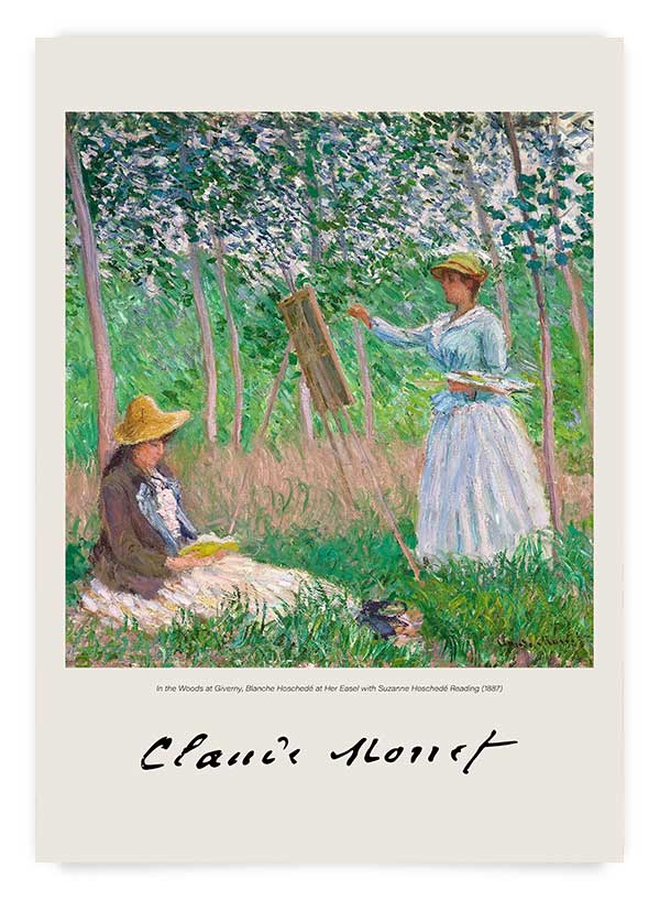 In the Woods at Giverny, Blanche Hoschedé at Her Easel with Suzanne Hoschedé Reading (1887) - Claude Monet.