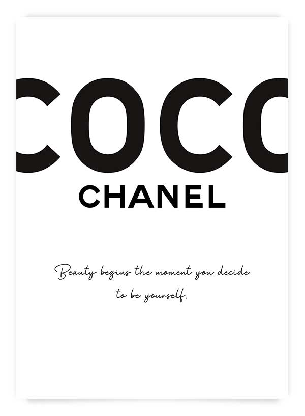Poster tipografic cu celebrul citat al lui Coco Chanel 'Beauty starts the moment you decide to be yourself'. Nu uita să adaugi o ramă albă, neagră sau de lemn.