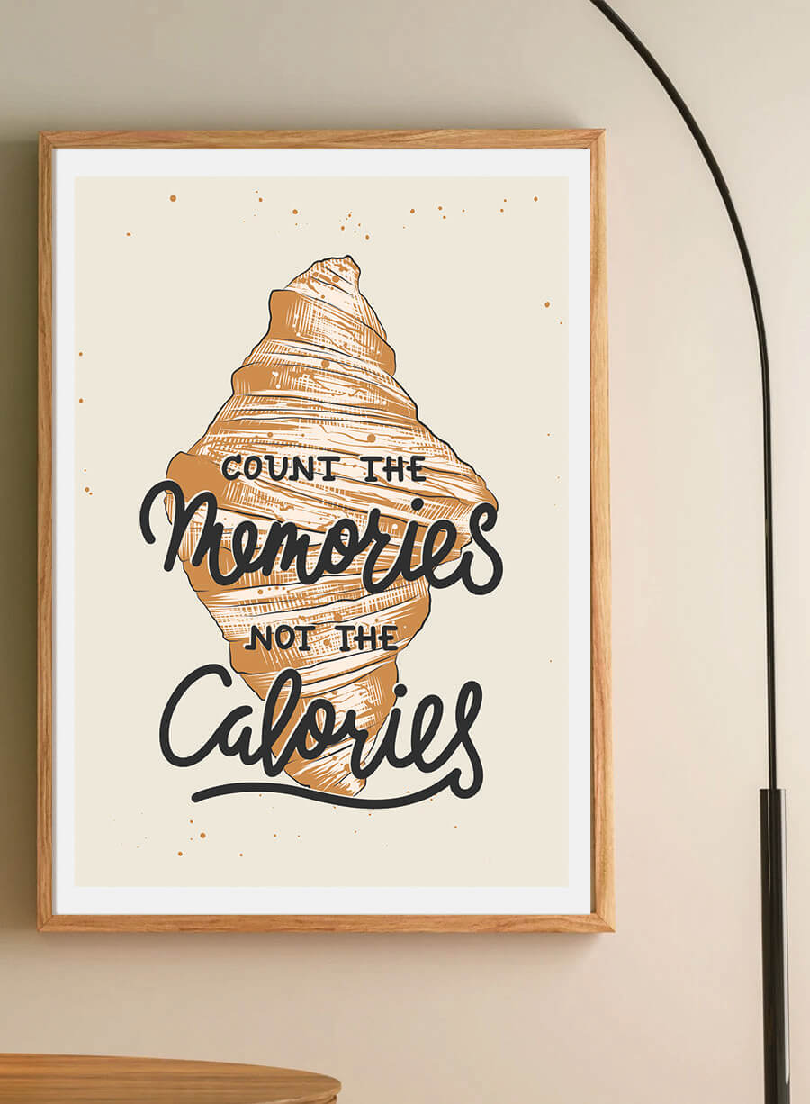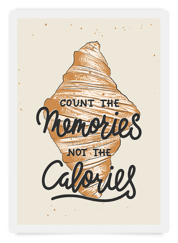 Poster motivațional pentru bucătărie cu text 'Count the memories not the calories' și ilustrație pe fundal bej.