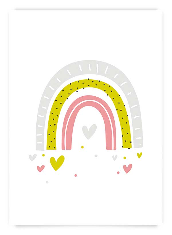 Un poster colorat pentru decorarea camerei copiilor. Ilustrație curcubeu pe fundal alb. Adaugă o ramă albă sau de lemn.