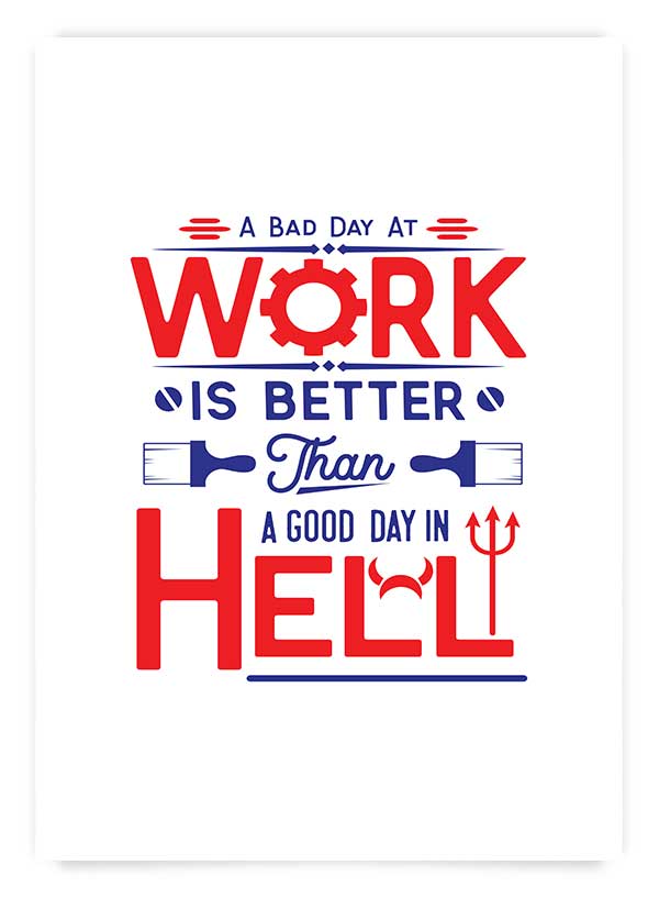 Poster tipografic amuzant cu text 'A bad day at work is better than a good day in hell.' Perfect pentru a fi oferit cadou colegului de birou, ca să-i faci zilele mai frumoase.