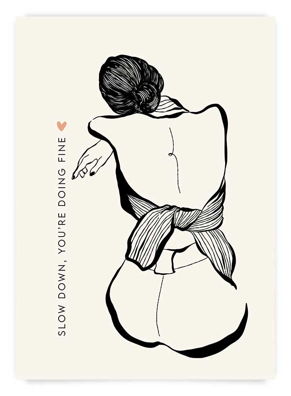 Ilustrație line-art și text 'Slow down, you're doing fine'.