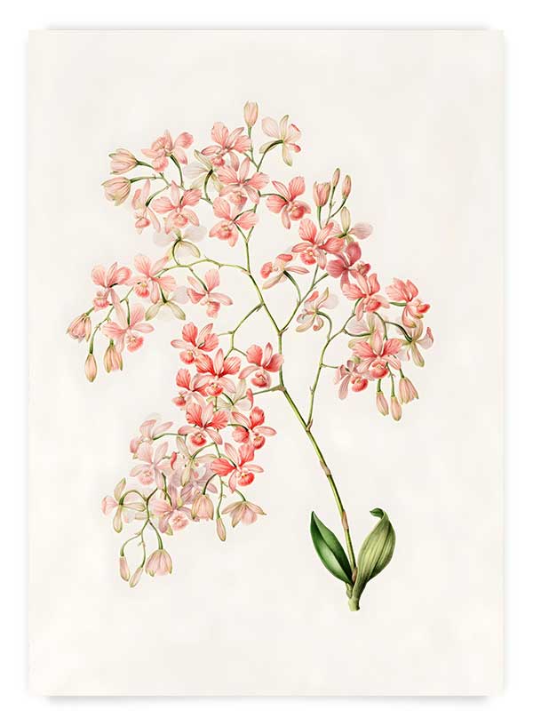 Poster vintage cu floare roz pe fundal elegant beige deschis. Ilustrația originală are o textură grainy/vintage și se potrivește perfect într-un decor cu elemente naturale, într-un spațiu cu plante și mobilier din lemn.
