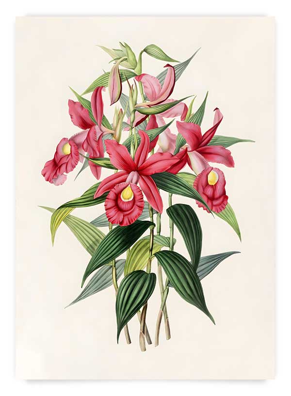 Poster vintage cu floare roz pe fundal elegant beige deschis. Ilustrația originală are o textură grainy/vintage și se potrivește perfect într-un decor cu elemente naturale, într-un spațiu cu plante și mobilier din lemn.