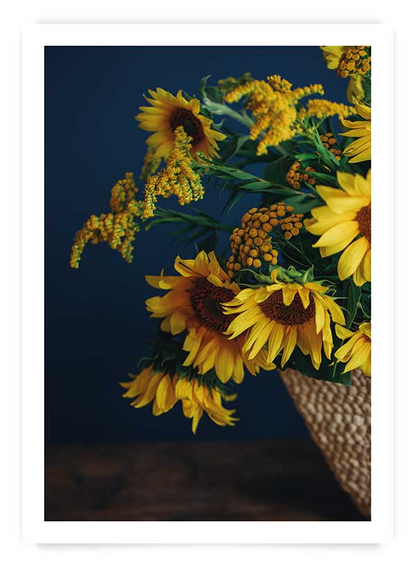 Alege acest poster botanic statement pentru decorarea bucătăriei sau a unui spațiu rustic. Fire de floarea soarelui într-un coș de paie, pe fundal bleumarin.