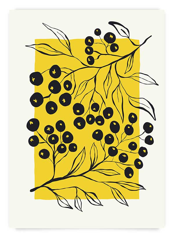 Poster din colecția cu tematică botanică - crenguțe cu frunze și fructe pe fundal galben.
