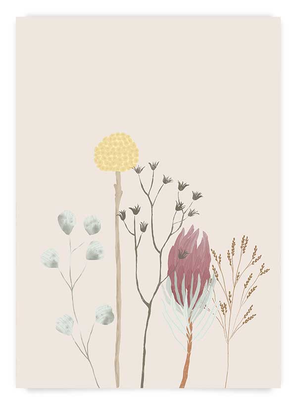 Ilustrații botanice în nuanțe neutre pe fundal beige. Poate fi comandat împreună cu modelul 'Flori uscate 2' pentru un set de 2 postere.