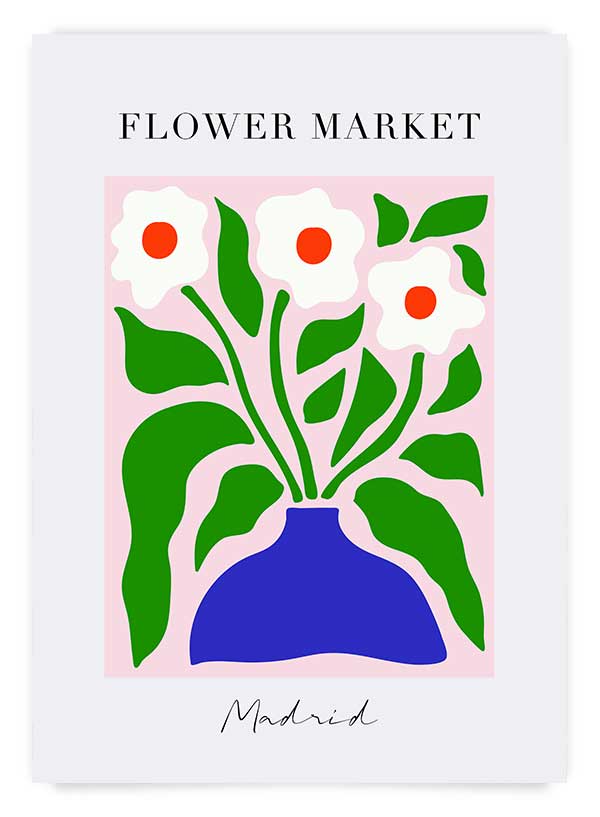 Poster modern cu o ilustrație veselă - vază cu flori - și text 'Flower Market' (în partea de sus) și 'Madrid' (în partea de jos).