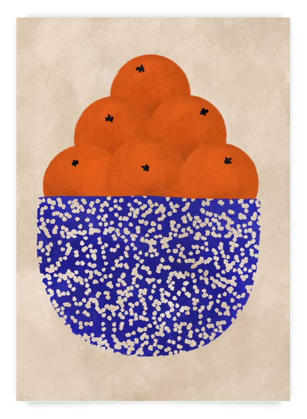 Ilustrație cu fructe într-un bol albastru pe fundal bej.