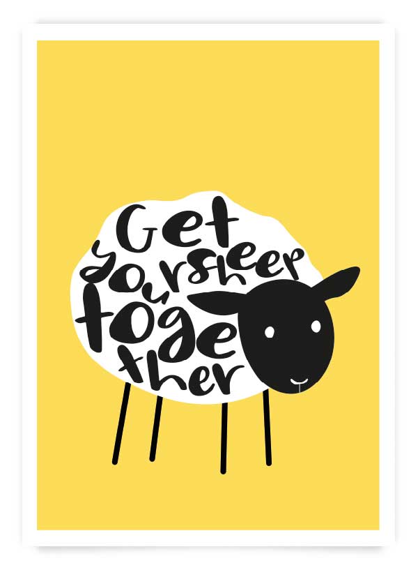 Un poster amuzant și vesel cu ilustrație și text pe fundal galben. Design-ul include o margine albă subtilă.