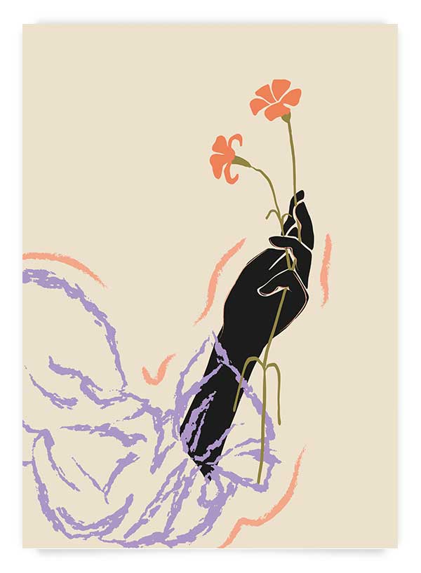 Amintește-ți în fiecare zi să dăruiești cu posterul 'Giving' - o ilustrație line-art în culori pastel cu o mână care oferă flori.