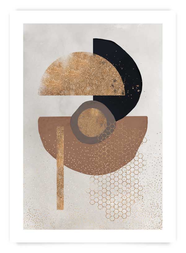 Poster geometric cu forme aurii și negre pentru un decor elegant. Poate fi comandat împreună cu modelele 'Gold flame 1' și 'Gold flame 3' pentru un set de 3 postere.