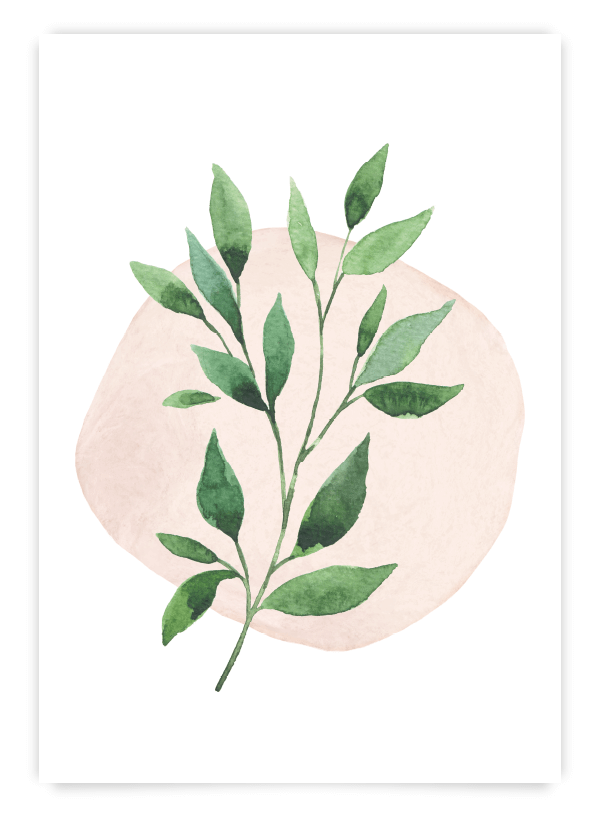 Poster botanic watercolor cu o crenguță cu frunze verzi pe un fundal roz pastel. Pentru crearea unui set de 3 tablouri poate fi combinat cu modelele 'Eucalyptus' și 'Eucalyptus branch'. Se potrivește foarte bine cu rame de lemn.