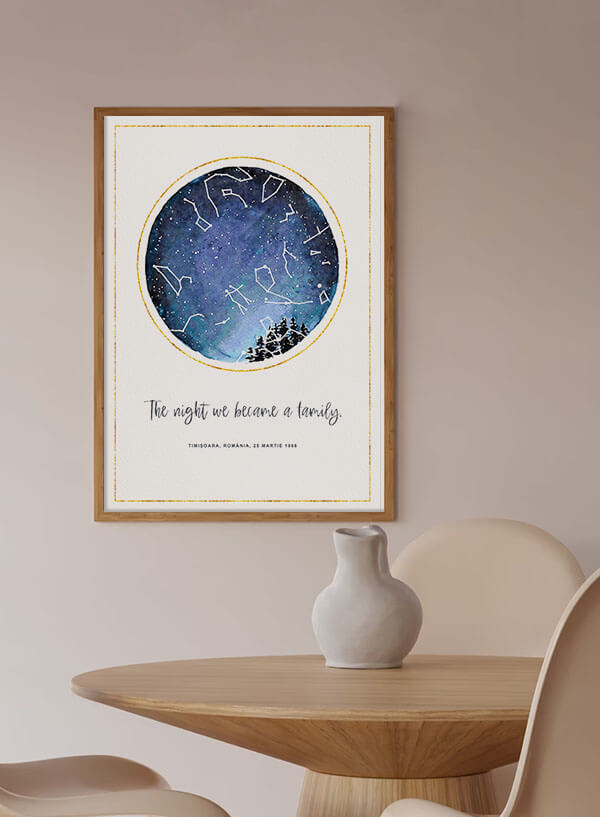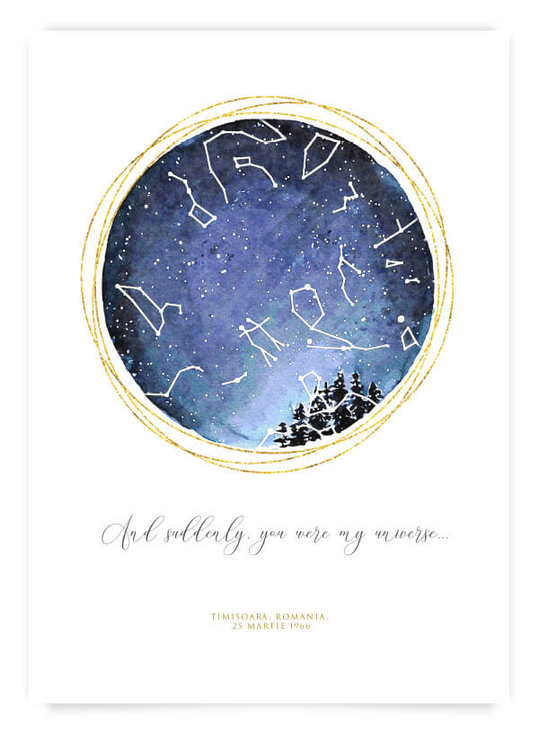 Poster personalizat cu harta stelelor așa cum se vedeau pe cer într-o zi specială din viața ta.♡ Poate fi ziua când v-ați cunoscut, când v-ați căsătorit sau ziua când ați aflat că veți fi părinți sau ziua când s-a născut cel mic. Un cadou special pentru toată viața!